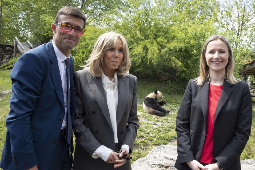 当地时间2023年5月17日,法国总统马克龙夫人布丽吉特(中)到访法国圣艾尼昂市博瓦勒野生动物园,向即将被送回中国的大熊猫“圆梦”告别。 中新社发 法国博瓦勒动物园 供图